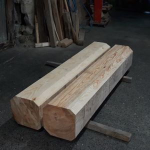 Sur ce tour, les pièces réalisées sont souvent des poteaux de charpente et supports verticaux de construction : pergolas, passages suspendus, portiques, galeries. Nous y faisons aussi toutes les pièces de dimensions hors normes : pieds centraux de tables, plateaux de table, boules à recouvrir de zinc pour faîtage, noues de charpente, tambour de puits.